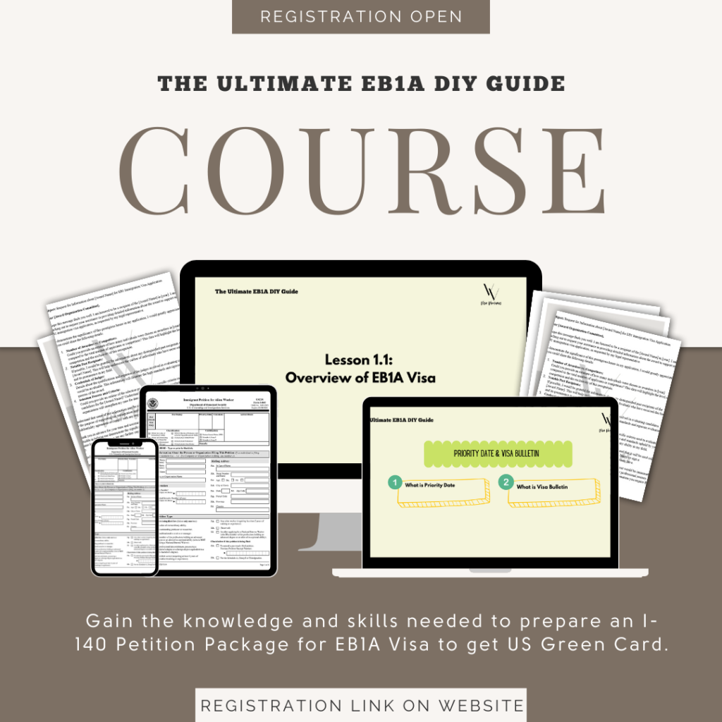 Tired of the overwhelming EB1A process? Hiring an attorney too costly? Look no further—The Ultimate EB1A DIY Guide is the most effective way to take control of your EB1A petition and get the results you want.